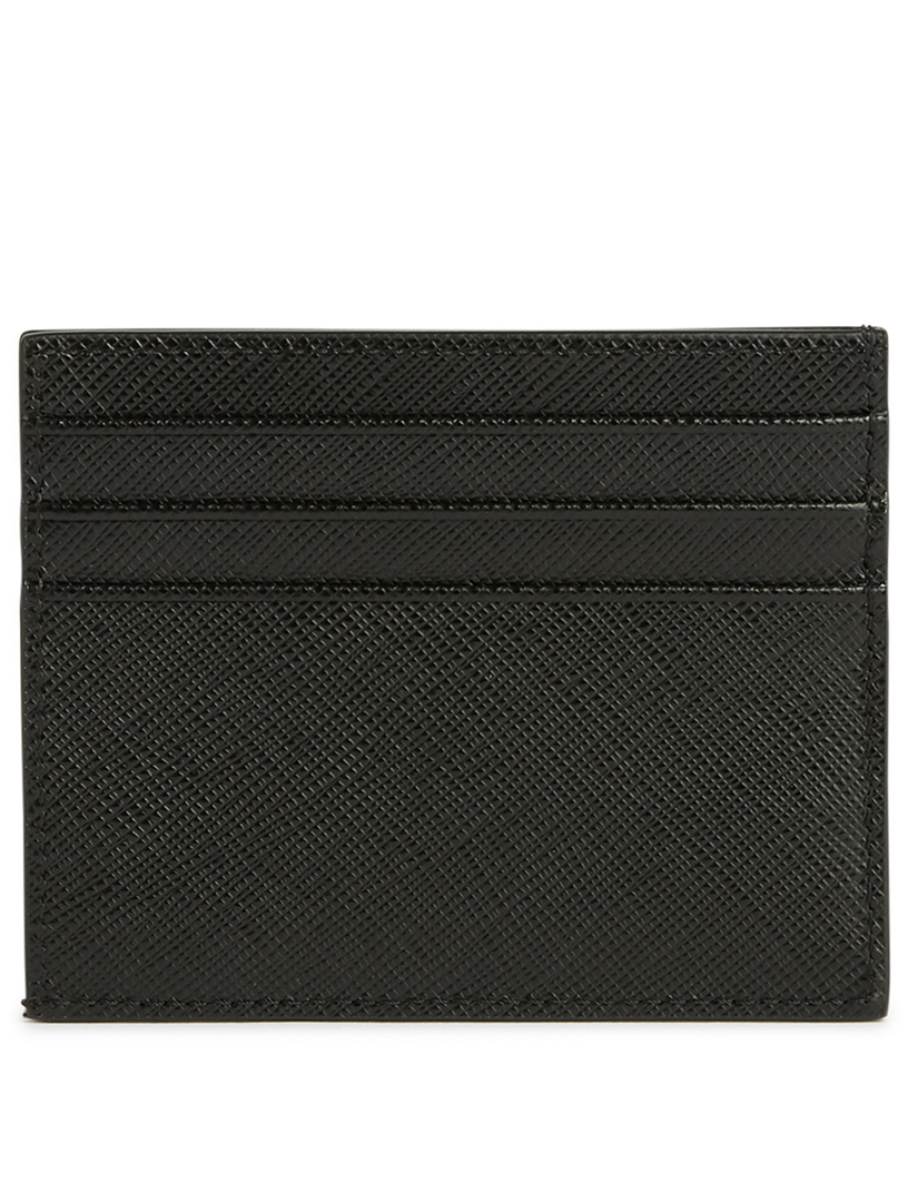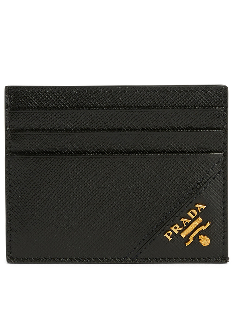 Saffiano leather card holder. This color-rich Saffiano leather card holder is accented with gold-finish Prada lettering. Small Saffiano Wallet - Black.